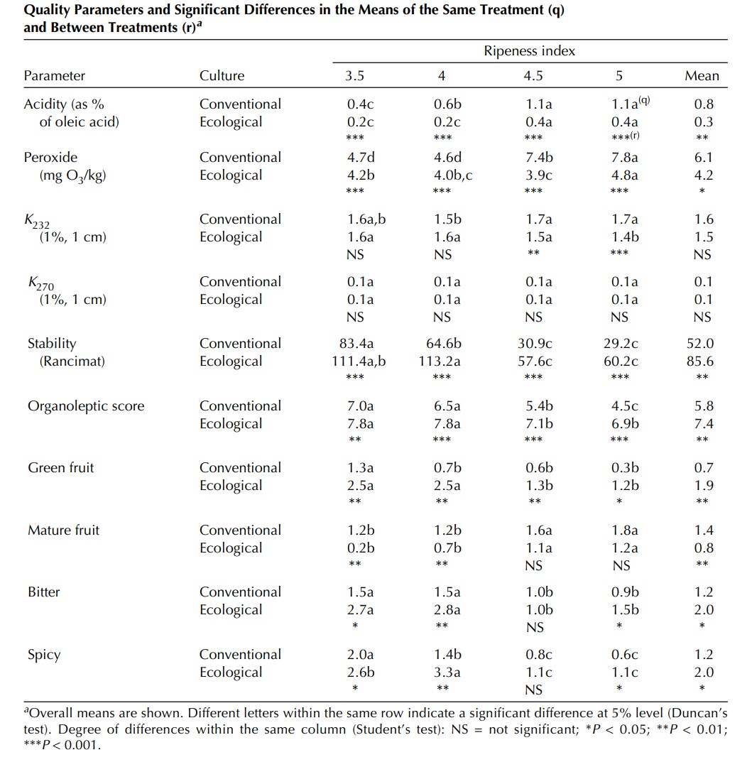 Les valeurs moyennes globales des huiles d’oliviers cultivés de manière biologique ont montré une qualité supérieure , par exemple une valeur d’acidité plus faible, un indice de peroxyde plus faible, une stabilité plus élevée et un score organoleptique plus élevé.