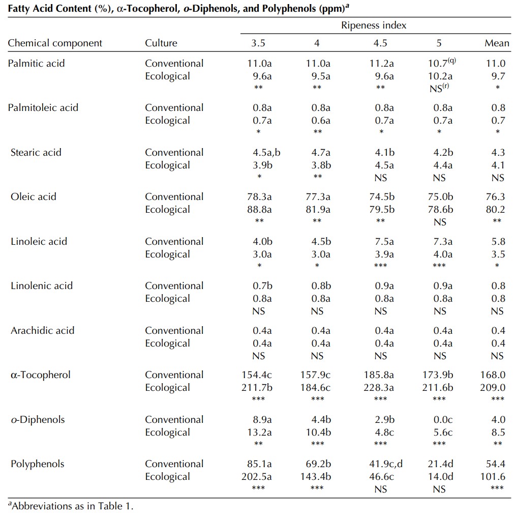 Dans les huiles conventionnelles et écologiques, les valeurs d’acidité augmentaient avec la maturation des fruits et dans les deux cas étaient 2,5 fois plus élevées à un indice de maturité de 5 (très mûr) qu’à 3,5 (partiellement mûr).